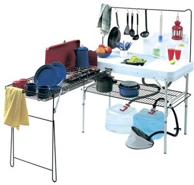 Features: Convenient kitchen, food prep and cooking center. Wire hanging/drying rack over sink. Packs compactly. Strong-rugged components, stable-contemporary design. 2 cutting boards slot vertically to form a windscreen, then store locked into sinks creating storage areas for drain hoses. Adjustable legs allow for leveling within 0.75". Wire rack supplied for storage under the table. Wire rack cooking surface attaches in 6 different positions. Fittings included for fresh water supply/waste water drainage. 2 sinks with faucet that can be hooked up to a foot pump and drain containers for a running water system. Weight: 26.5 pounds. Dimensions: 44"W x 24.5"D x 33"H.